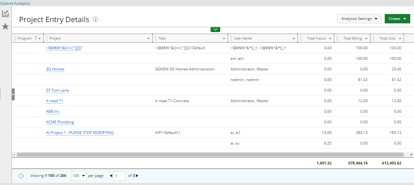 Remarque: Le rapport est filtré pour afficher uniquement les données du programme inachevées. Vous pouvez approfondir l'analyse jusqu'au rapport détaillé de l'entrée du projet.
