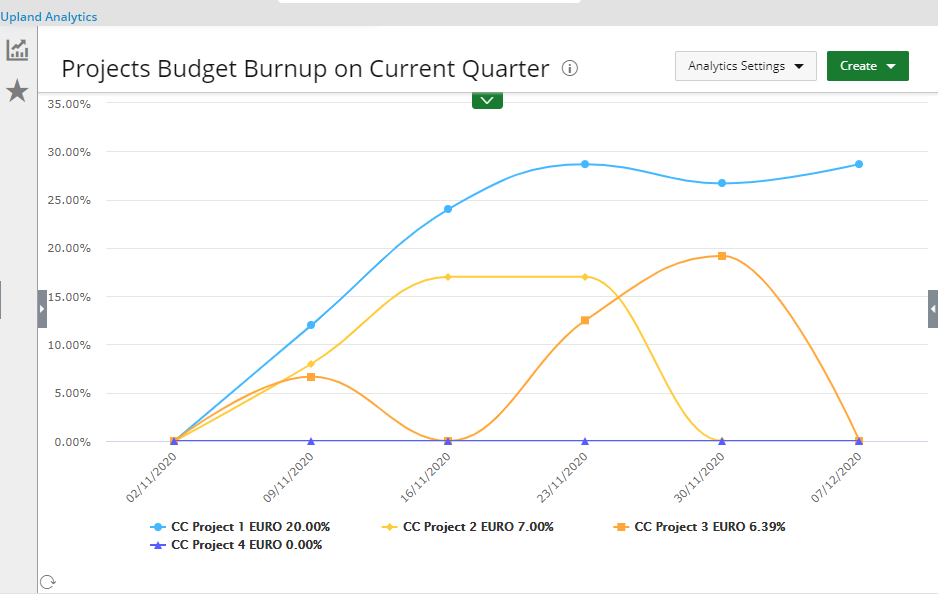 - Détaille la tendance de l'épuisement du budget (pourcentage du KPI de temps réel / KPI du budget de temps actuel) des projets attribués à l'utilisateur connecté au cours du trimestre en cours.