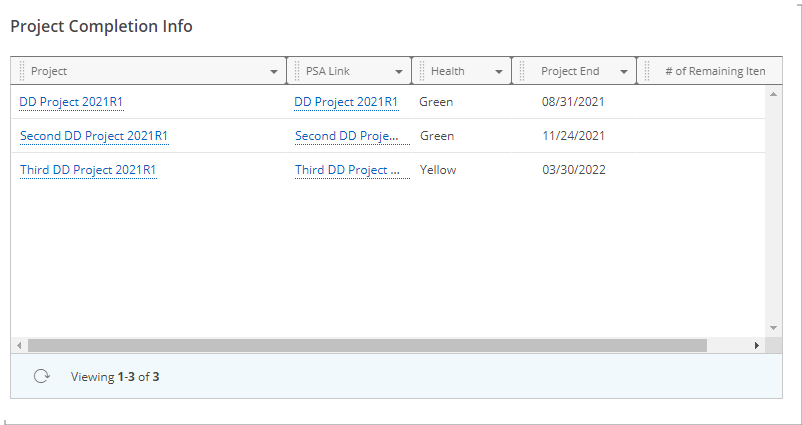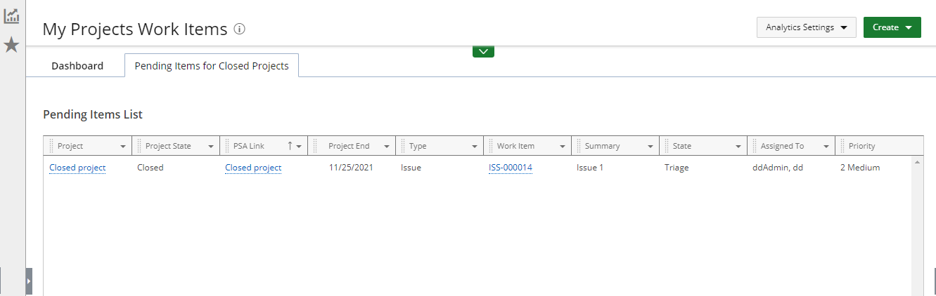 Le tableau de bord des éléments de travail de mes projets permet aux chefs de projet d'avoir un aperçu de leurs éléments de travail de projet (entrées d'éléments de travail associées à un projet pour lequel ils sont le chef de projet nommé) et d'y accéder rapidement.