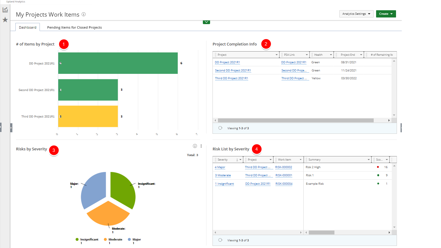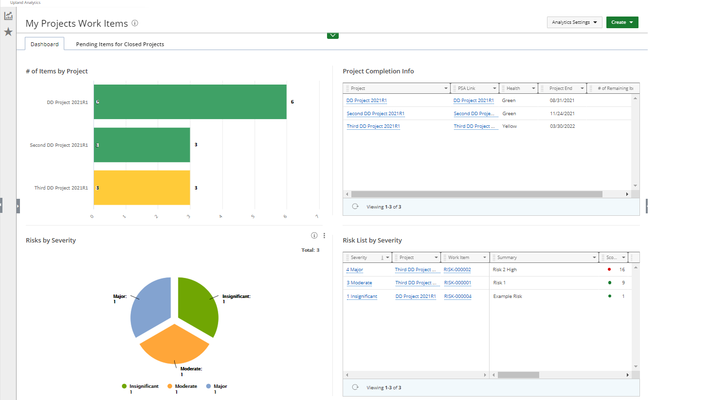 Cet article détaille le tableau de bord d'éléments de travail Mes projets prêt à l'emploi sous Upland Analytics > Tableaux de bord et rapports > Gestionnaire de projet d'éléments de travail.