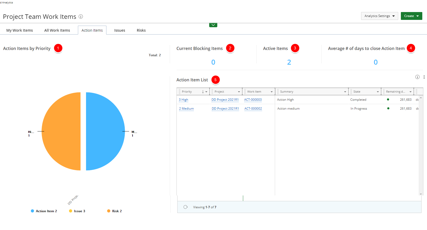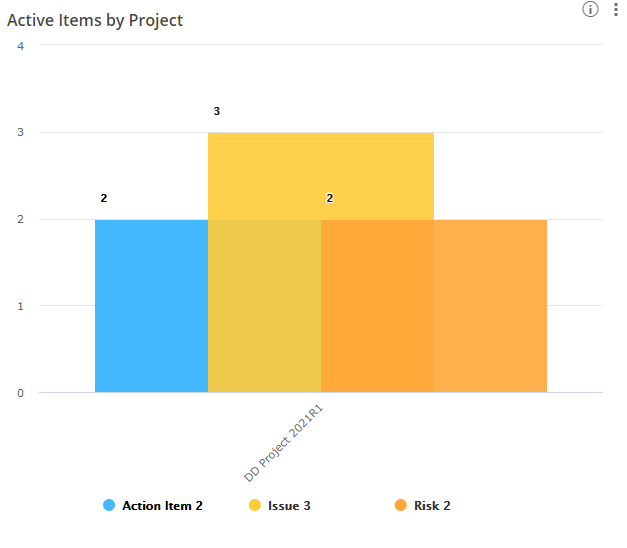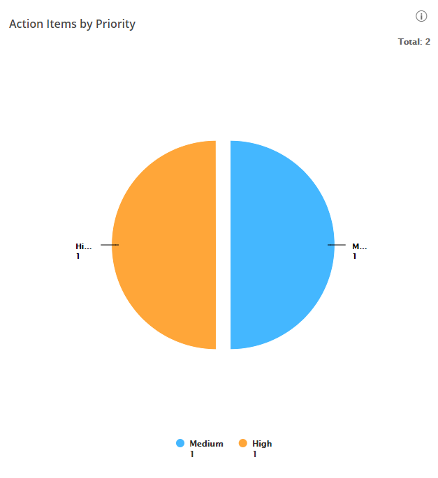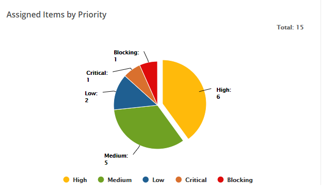Ce diagramme circulaire affiche le nombre d'entrées d'éléments d'action regroupées par priorité qui sont en cours associées au(x) projet(s) dont l'utilisateur connecté est membre de l'équipe.