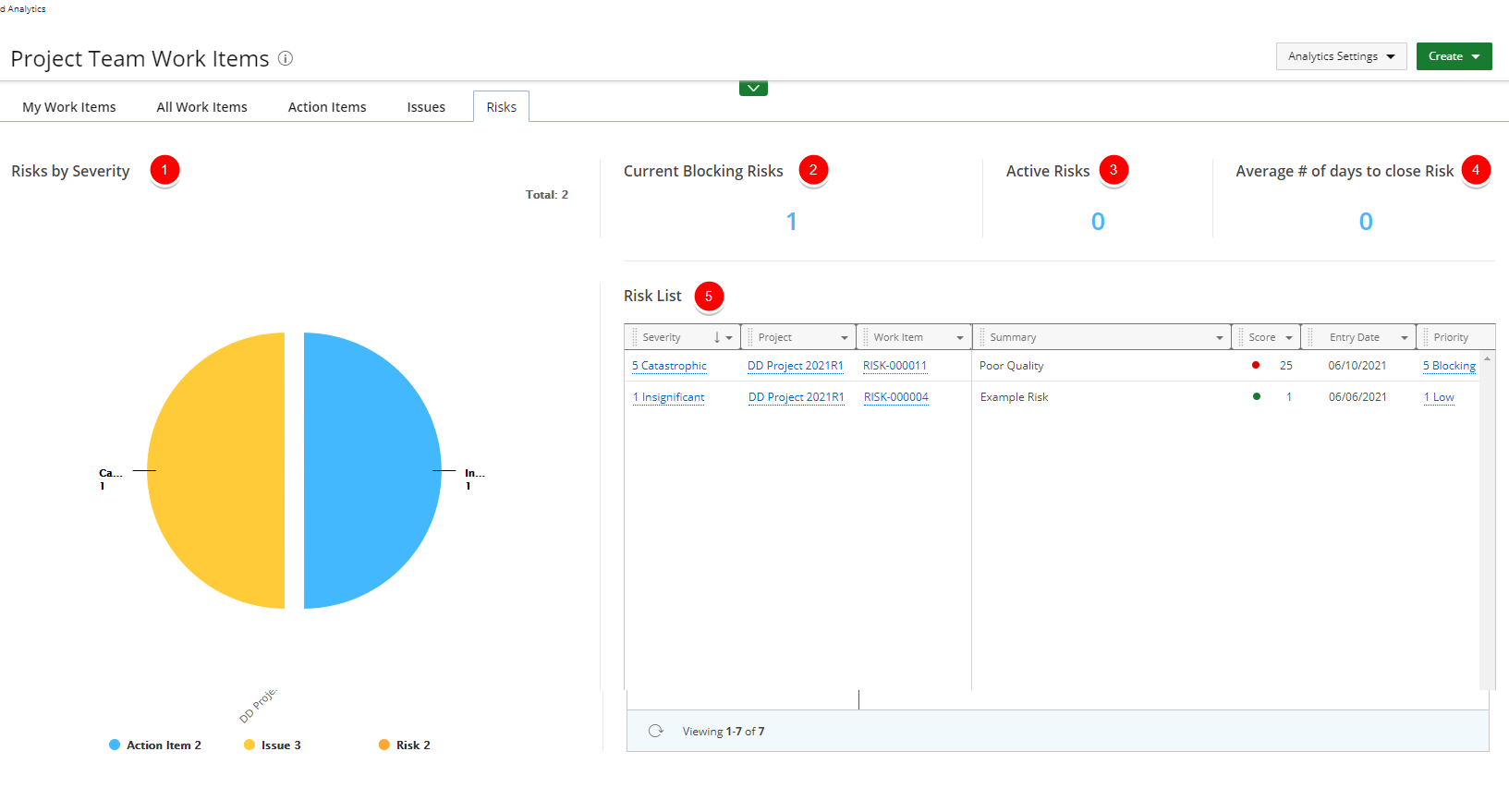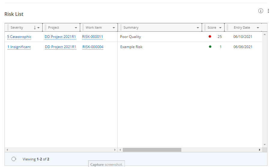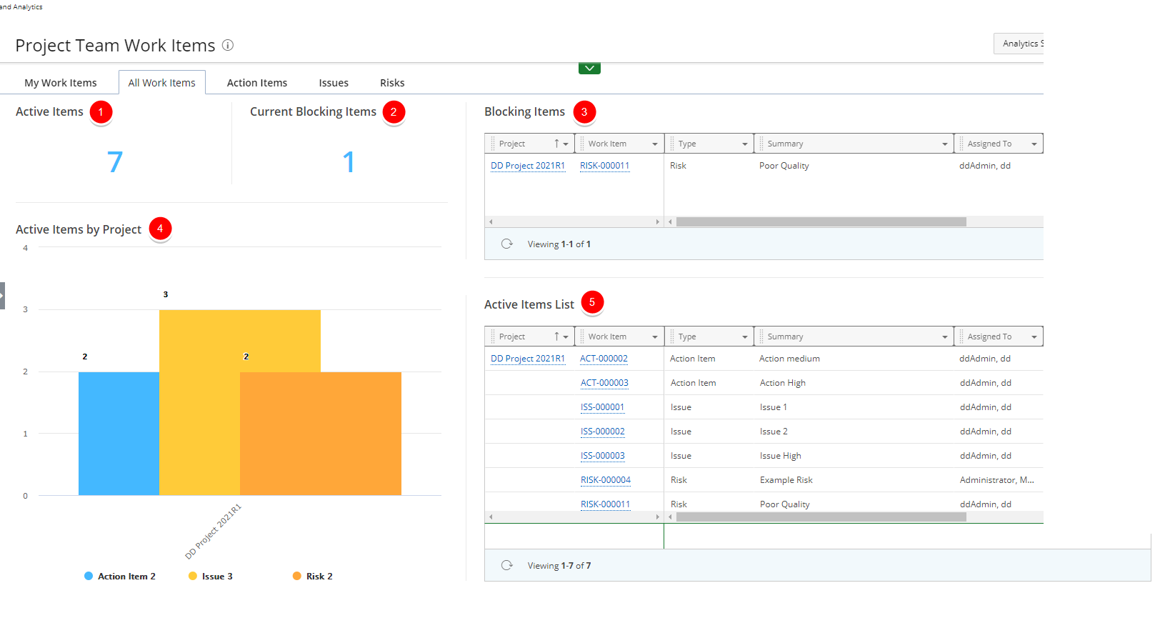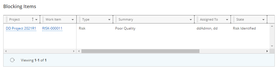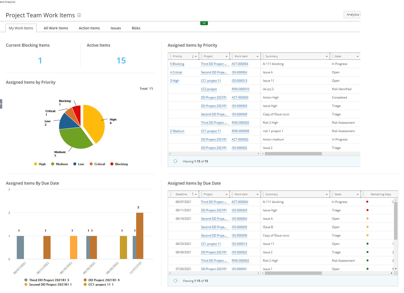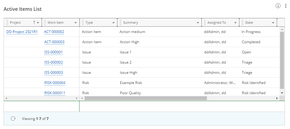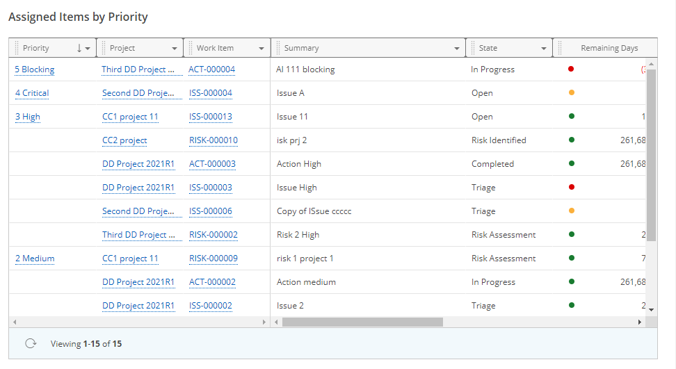 Vous pouvez également accéder à la page d'édition de projet ou d'entrée de risque correspondante en cliquant respectivement sur le nom du projet ou sur le numéro de suivi de l'élément d'action.