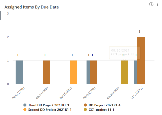 Ce graphique à barres affiche le nombre de toutes les entrées d'éléments de travail actives dans un état ouvert et associées aux projets dont l'utilisateur connecté est membre de l'équipe.