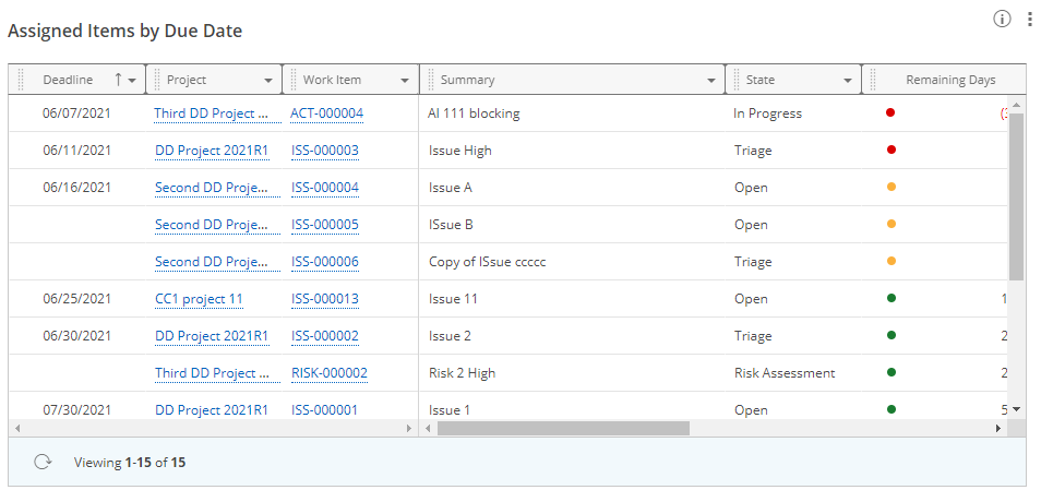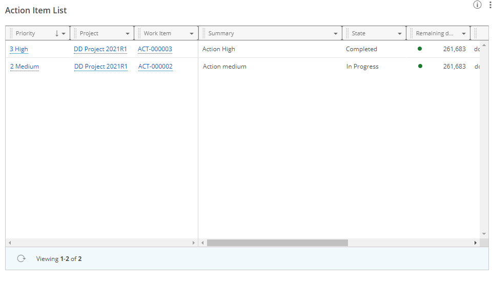 Vous pouvez également accéder à la page d'édition correspondante du projet ou de l'entrée d'élément d'action en cliquant respectivement sur le nom du projet ou sur le numéro de suivi de l'élément d'action.