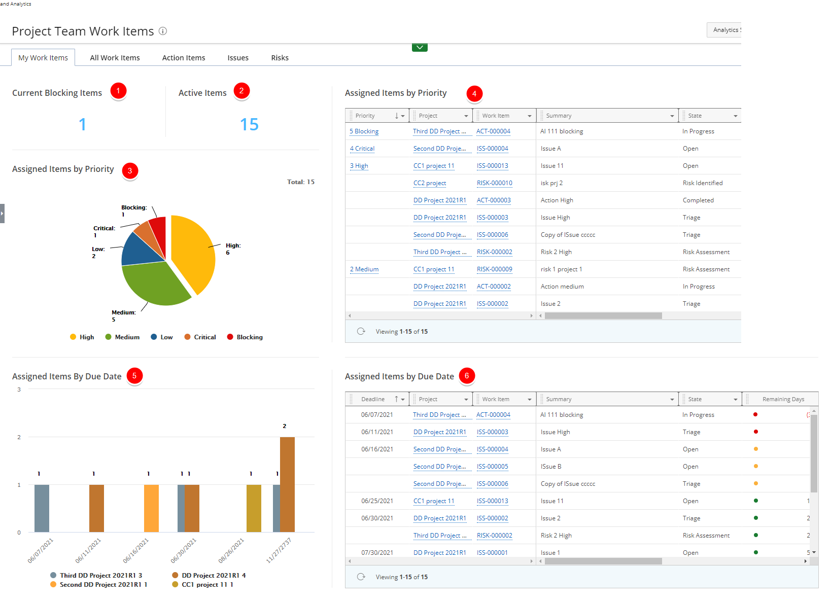 Le tableau de bord des éléments de travail de l'équipe de projet vous permet d'avoir un aperçu des éléments de travail de l'équipe de projet (entrées d'éléments de travail du projet pour lesquelles les membres de l'équipe de projet sont affectés) et d'y accéder rapidement.