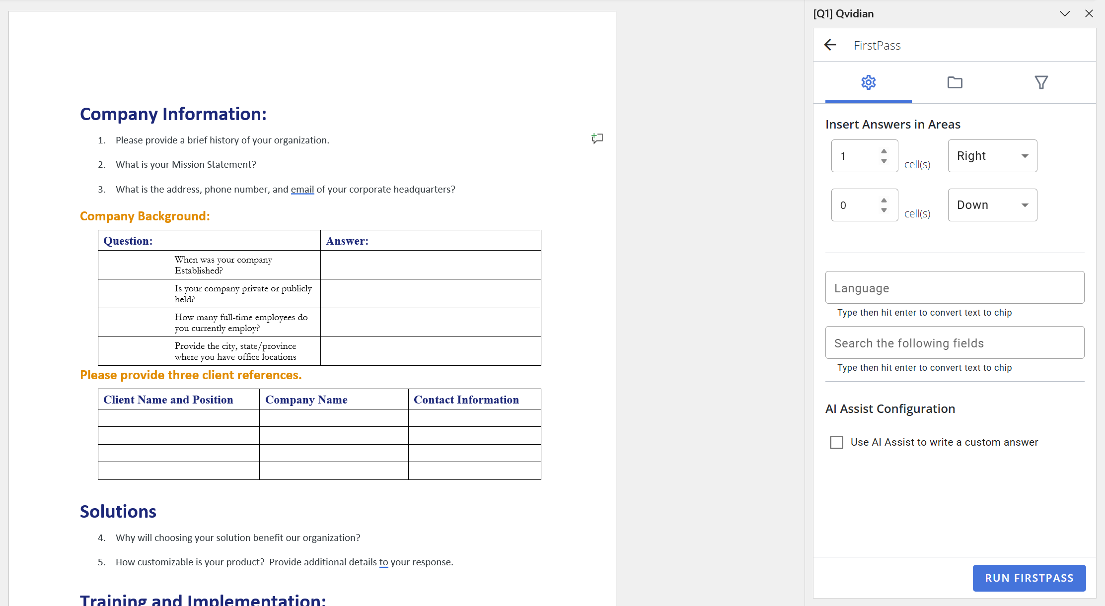 Use AI Assist to answer questions in Qvidian for Office and Web. Automatically create a custom answer to individual questions in Word, Excel, and Qvidian for Web or use FirstPass to answer multiple questions directly in Word or Excel.