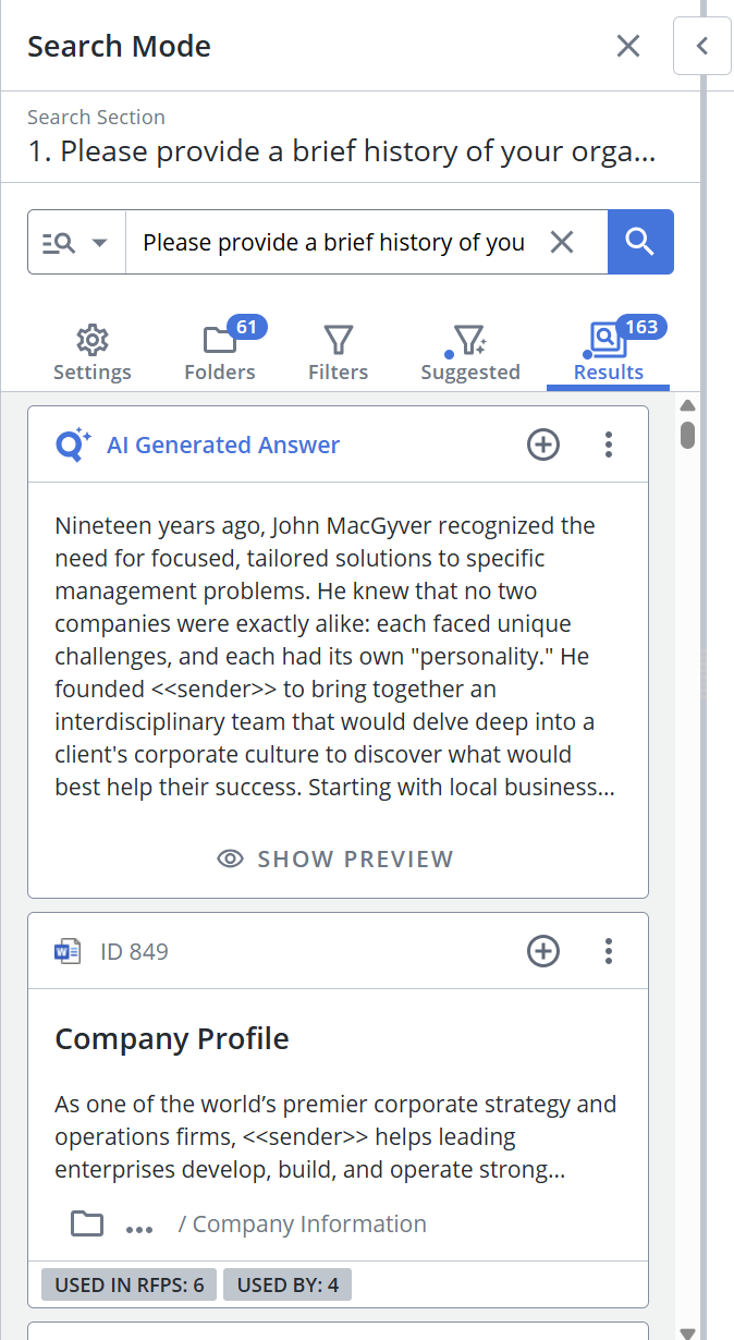 6. Found content can be dragged and dropped directly from the Search Mode panel onto the RFP to add the answer, or the insert icon can be clicked.