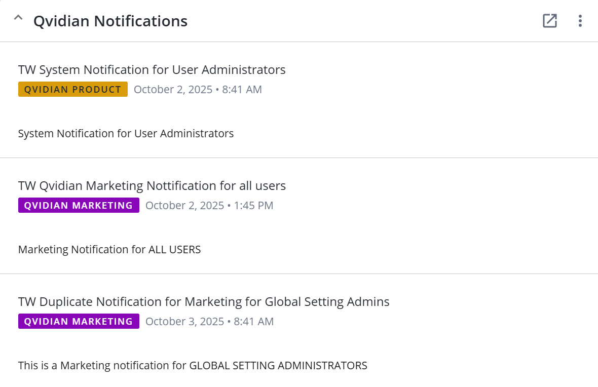 From this item, you can view Qvidian product and marketing notifications, which can provide links to training videos, webinar sign-ups, and surveys. To view notifications: