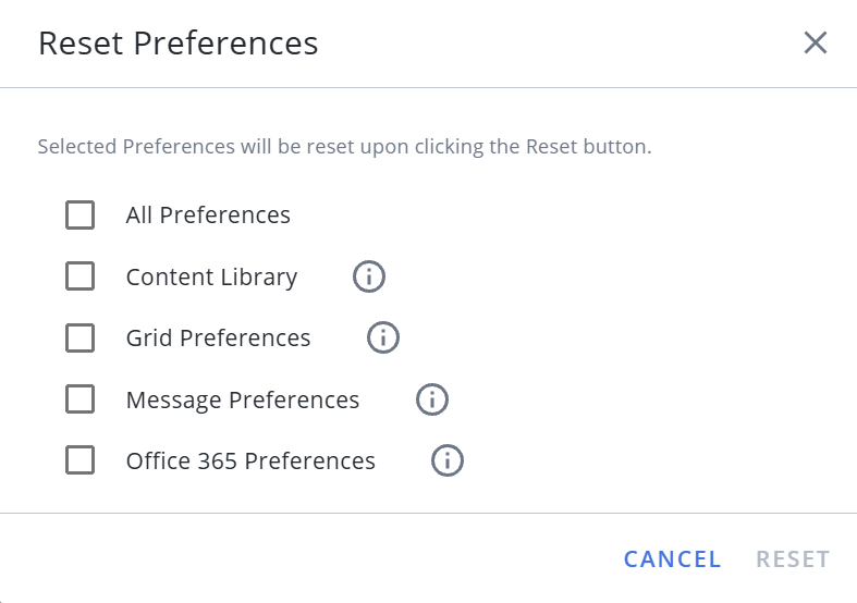 icon and select Reset Preferences from the dropdown menu. - Select the checkboxes of the preferences you want to reset:
