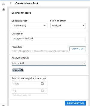 Use the data management menu to anonymize data within a date range. Anonymized fields display the word anonymized in the dashboard in place of the field details.