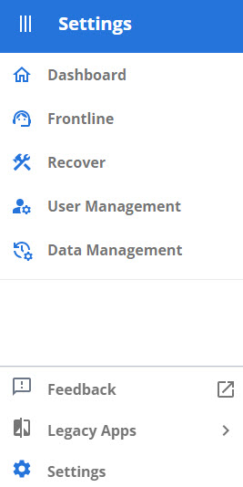 Modules intended for managing your communication and feedback, e.g. Recover and Frontline and the modules intended for administrative tasks, e.g. Data Management and User Management will appear at the top of the sidenav menu.