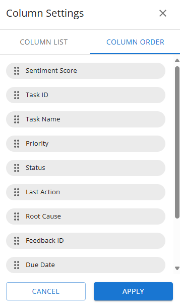 In the Column Order tab, drag and drop the columns to rearrange the columns in the desired order for display in the message panel.