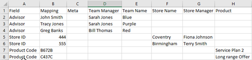 Mapping Choose the field option that you want to map from—it must be an option from the field you just selected. For example, if you select the field Adviser, you should enter one of your advisers in this field (eg. John Smith). Meta Leave this column blank (it acts like a dividing line when communicating with the Dashboard). Team manager Enter the name of a team manager if you want to map them to the selection in your Field and Mapping columns. Team name Enter a team name if you want to map it to the selection in your Field and Mapping columns. Store name Enter a store name if you want to map it to the selection in your Field and Mapping columns. Store manager Enter the name of a store manager if you want to map them to the selection in your Field and Mapping columns. Product Enter the name of a product if you want to map it to the selection in your Field and Mapping columns. Example: After the above import file is uploaded, when "John Smith" is entered into the Advisor field, the Team manager field will automatically be filled with "Sarah Jones", and the Team name field will automatically be filled with "Blue".