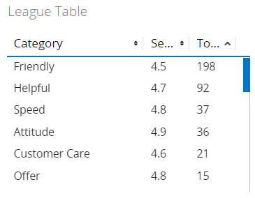 The League table widget is one of the most commonly-used widgets on the Dashboard because it can be used for multiple different things. You can rank multiple factors based on how your customers feel about them in your feedback—for example, you can rank and compare your: