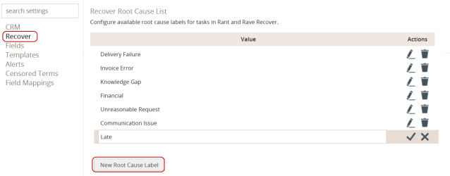 Admins can configure root cause labels for tasks in Recover. To learn more, refer to Defining the root cause of a task.
