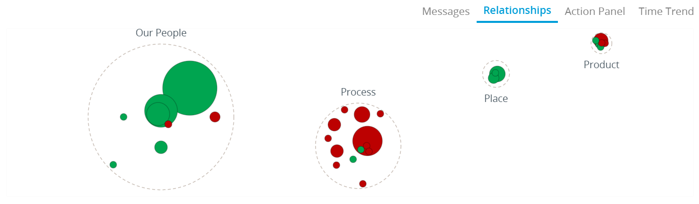 • The large dashed circles represent the top-level categories at your organization (for example "People" or "Product). The colored bubbles illustrate positive (green), negative (red), and neutral (amber) feedback which mentions specific phrases.