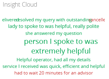 You can see the most common positive and negative insights in your Insight cloud widget. Green insights are positive, red are negative, and the larger the phrase the more frequently it occurs.
