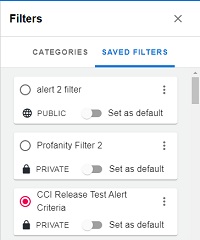 Access the filter options by selecting the filter icon to expand the menu. You can select filter options from the drop down menus in the categories tab or select saved filters from the saved filters tab.