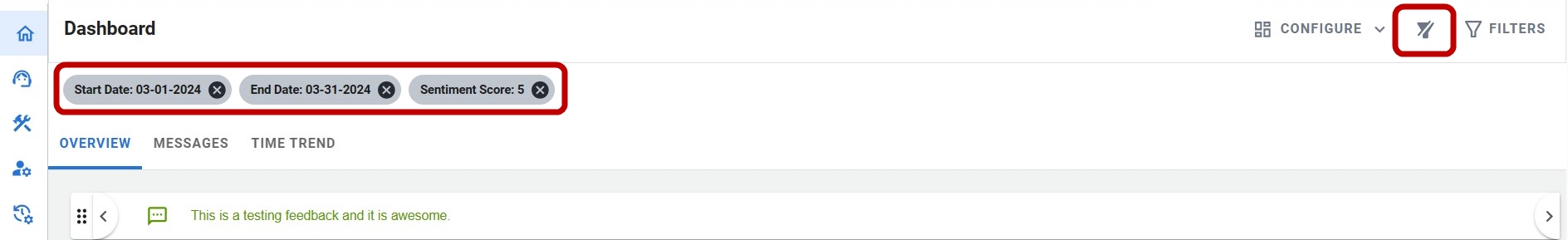 Applied filters are displayed at the top of the dashboard (above the tabs). Clear applied filters using the icon to the right of the applied filters list.