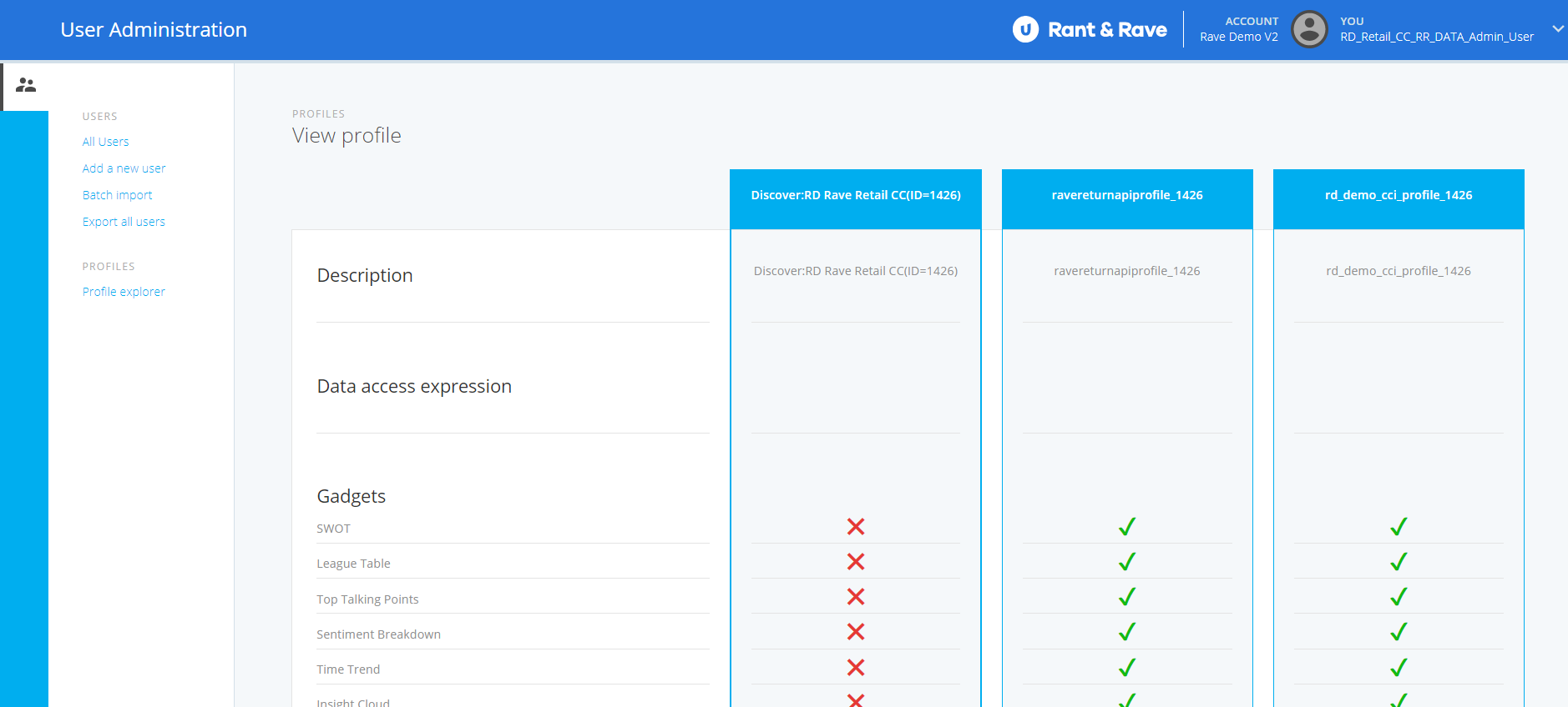 Before a user can access their projects or teams, they’ll need to be assigned a profile. Profiles determine the level of access a user has; for example, which Rant & Rave modules they can access, which gadgets are displayed in each module, and which features they can see on their Dashboards.