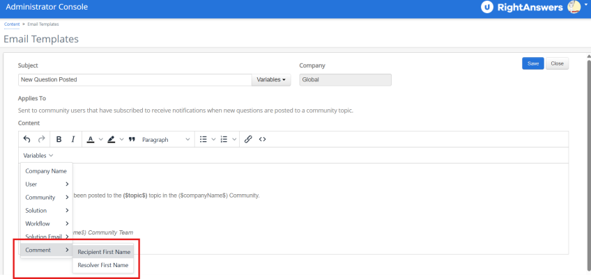 You can now create personalized email notification templates for comments using the new variables we have introduced. Two new variables have been added to the Comment variable in the email templates under the Administrator Console > Content > Email templates: