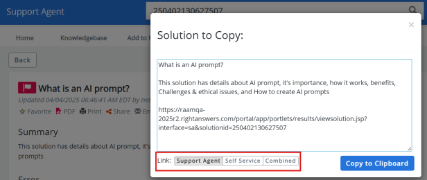 We have enhanced the copy-to-clipboard functionality to give you more control over what gets copied. When you click Copy to Clipboard in a solution in the Support Agent portal, you will have the option to select which link you want to copy: