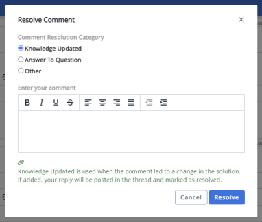 You can now add an optional comment when you resolve a comment using the Knowledge Updated and Other resolution categories in addition to the existing mandatory comment for Answer to Question.