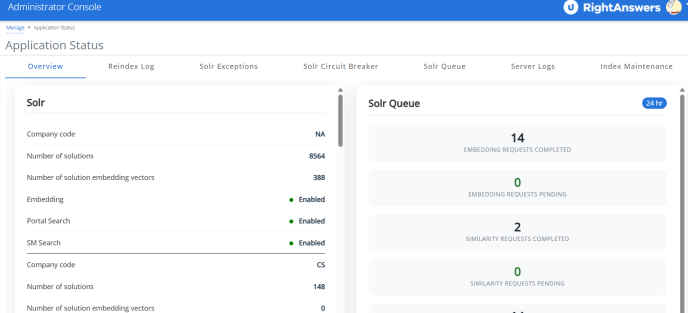 The core of the new design is the Overview tab, which provides a comprehensive, 24-hour snapshot of the application's current health and status. This tab centralizes vital information across key areas: detailed Solr connection health and the status of Solr Queue (pending and completed indexing requests); Database health, performance, and connection statistics; and Tomcat server status, uptime, and resource utilization, including a convenient Clear Cache button.