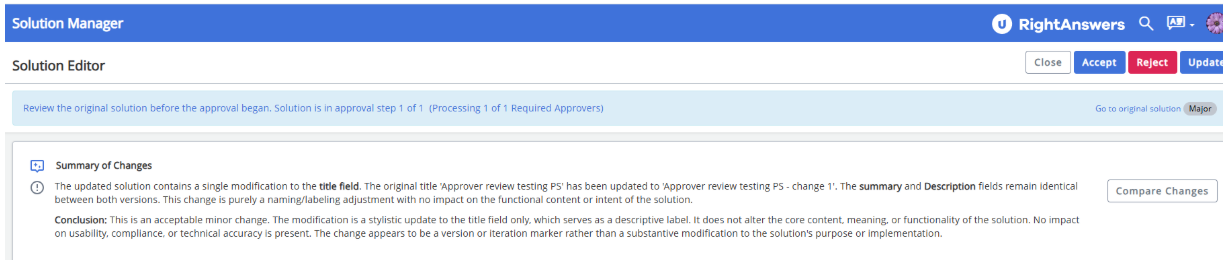 The AI Approver Review feature now evaluates all changes in a revision by comparing the revision solution to its base solution (the parent solution) in an approval workflow. It lists all cumulative modifications made since the solution was created. This improvement highlights key differences more effectively, replacing the earlier method where comparisons were made only against the immediately preceding version.