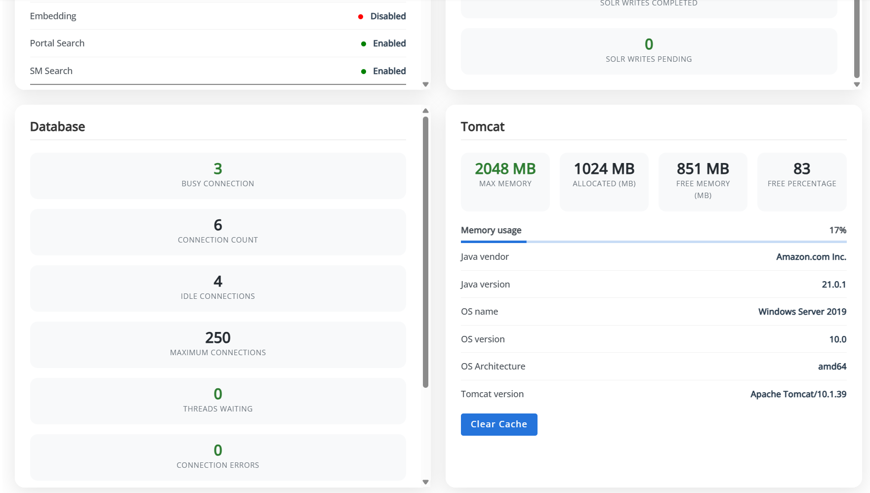 Tomcat server status, uptime, and resource utilization in the Tomcat section. This section also provides a Clear Cache button.
