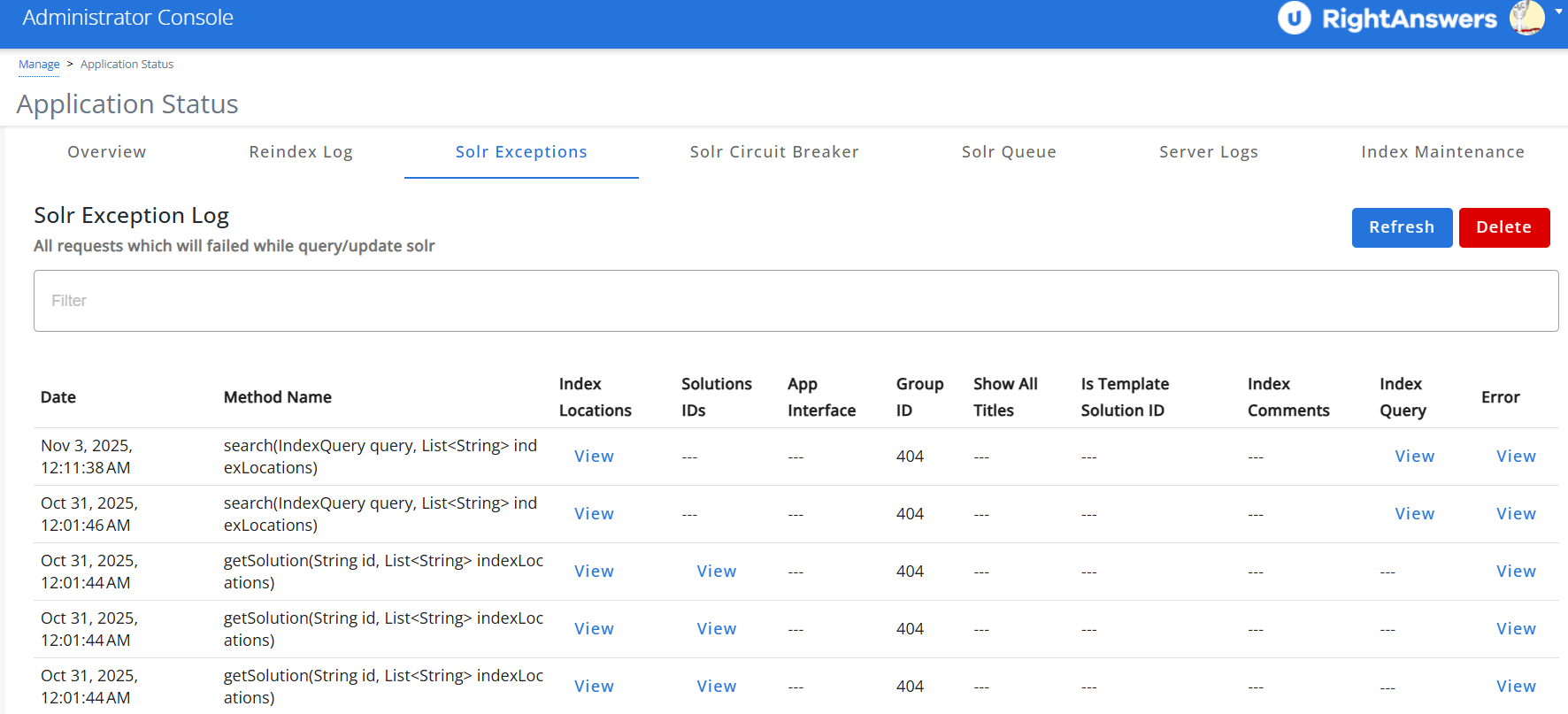 The Solr Exception tab provides Super Admins with a detailed view of all failed Solr query or update requests. It also offers quick actions to delete logged exceptions and refresh the page to display the most up-to-date information.