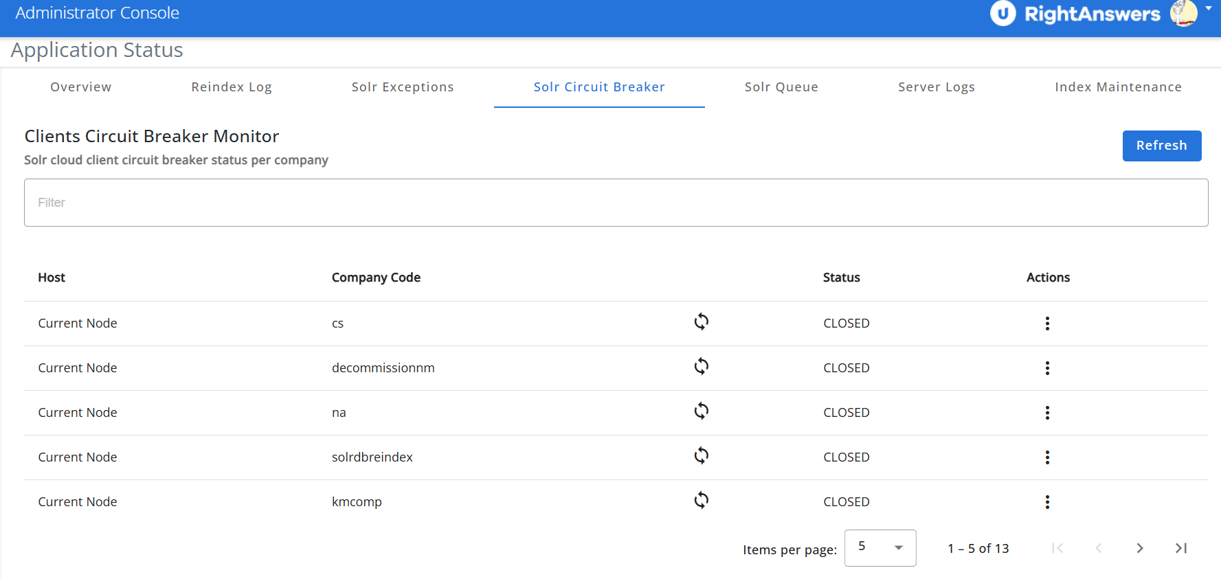 This tab helps monitor and manage the status of the Solr cloud circuit breakers across all companies.