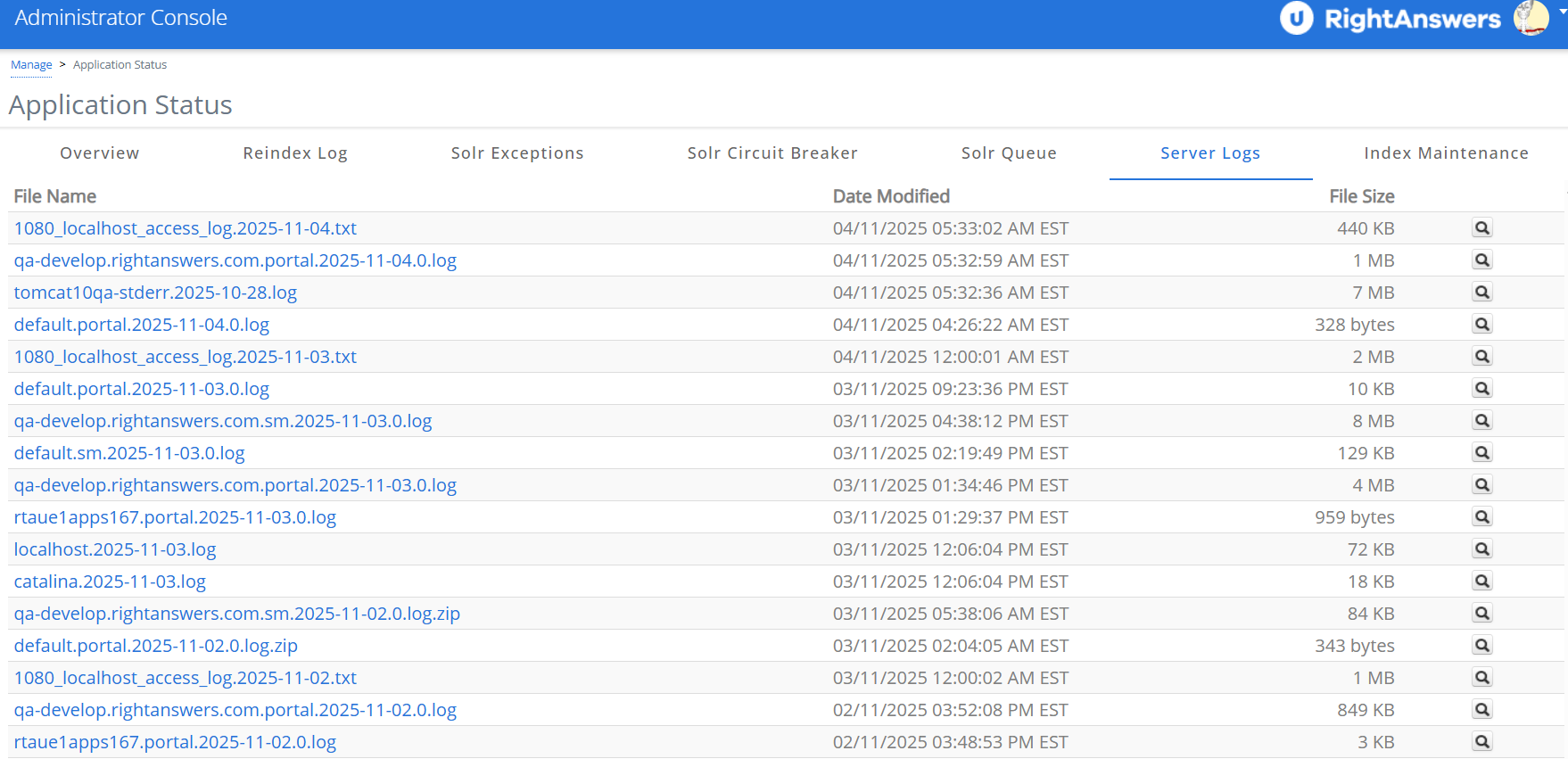 For more information, refer to RightAnswers: Admin: Server Logs .