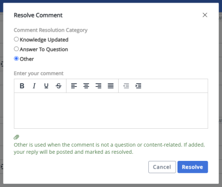 - Enter a relevant resolution comment. If you add a comment, it will be posted in the thread and marked as resolved. Resolution comment is mandatory for the Answer to Question option and optional for the Knowledge Updated and Other options.