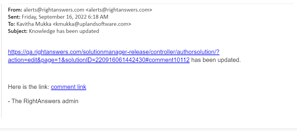 Example of an email notification for 'Knowledge Updated' resolution category:
