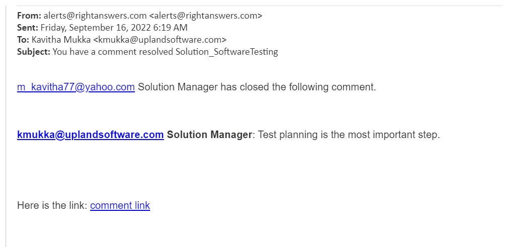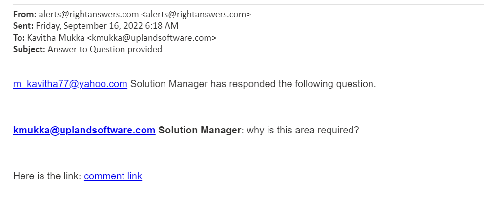 Example of an email notification for 'Answer To Question' resolution category: