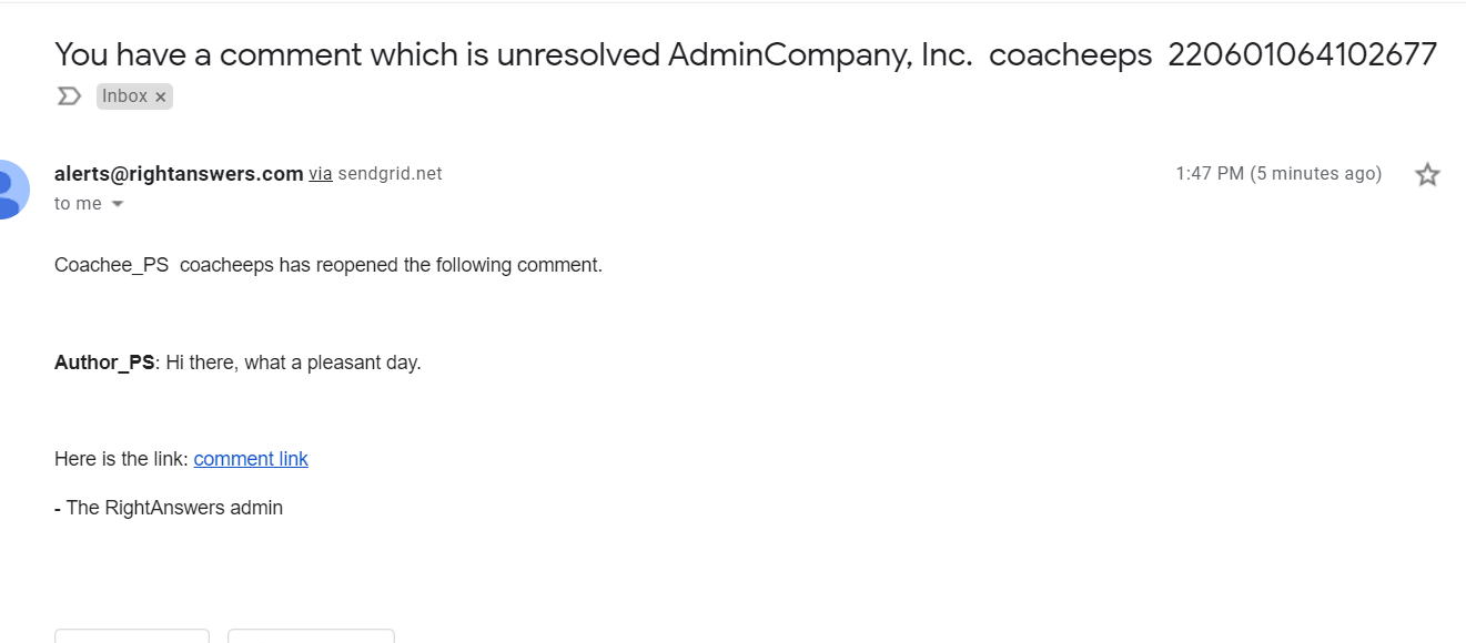 Example of an email notification about an unresolved comment/reply: