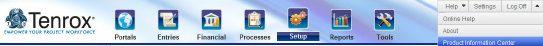- Help button that opens the online help system and the version information for the installed application, as well as the Tenrox Support Center page