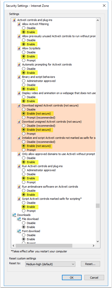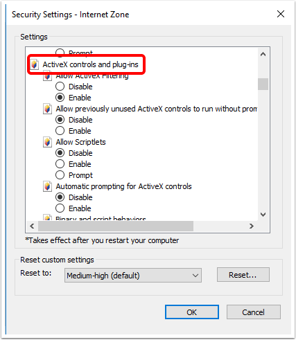 - Make sure that the Enable option is selected for all ActiveX Controls and Plug-ins items.