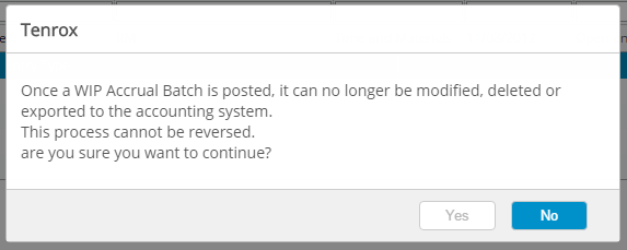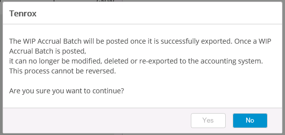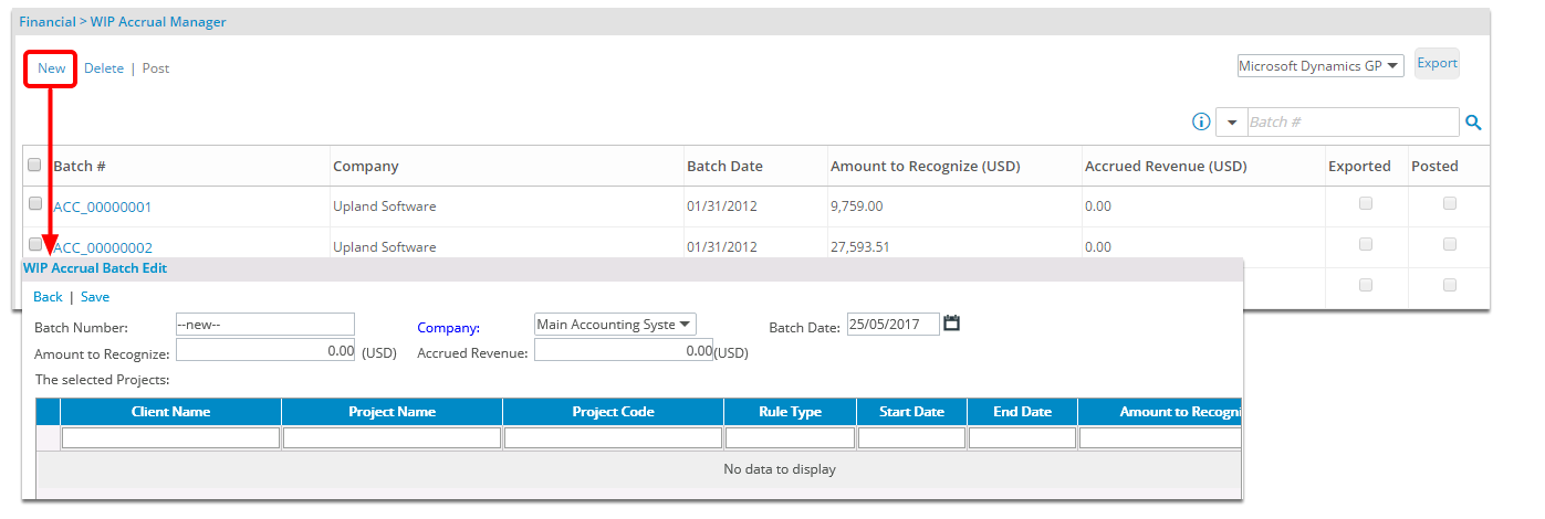 Before a WIP accrual batch is generated, the projects are first included to the accrual batch. From the WIP Accrual Manager page, users can create, delete, post and export WIP accrual batches with transactions.