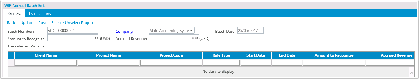 Note: Click here to view the how do I define a WIP Accural Batch Number article for more information. After a WIP accrual batch is saved, the General and Transactions tabs are displayed, the Company and Batch Date boxes are no longer editable, and as long as the Allow WIP Accrual number override option is selected, the batch number can be edited. When a batch number is changed, the system verifies that the number entered is unique; otherwise, the batch number cannot be saved.