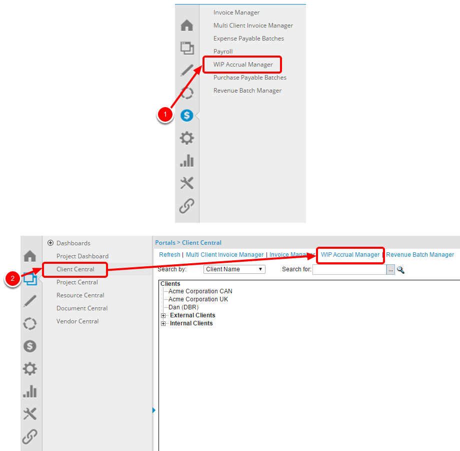 - Click Portal in the Icon Bar. The click the Client Central link in the Navigation Menu. Then select the WIP Accrual Manager tab within the Client Central page.