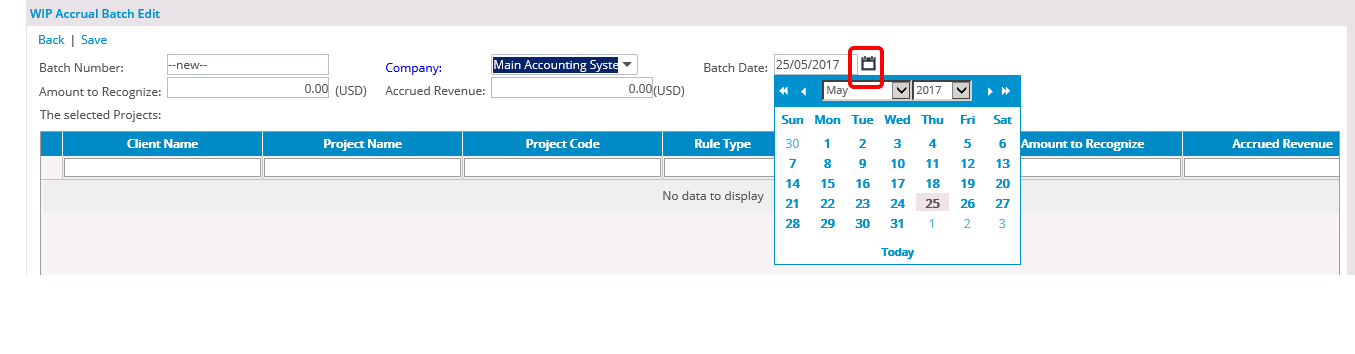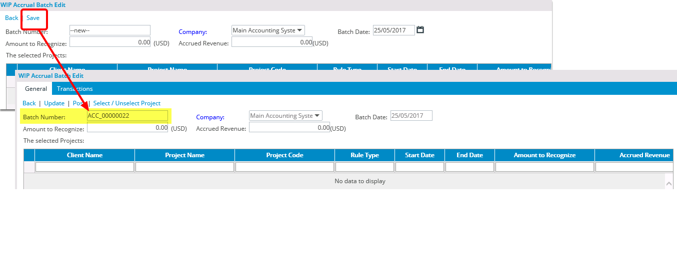 - Click the Save link to automatically generate the batch number using the defined accrual settings.