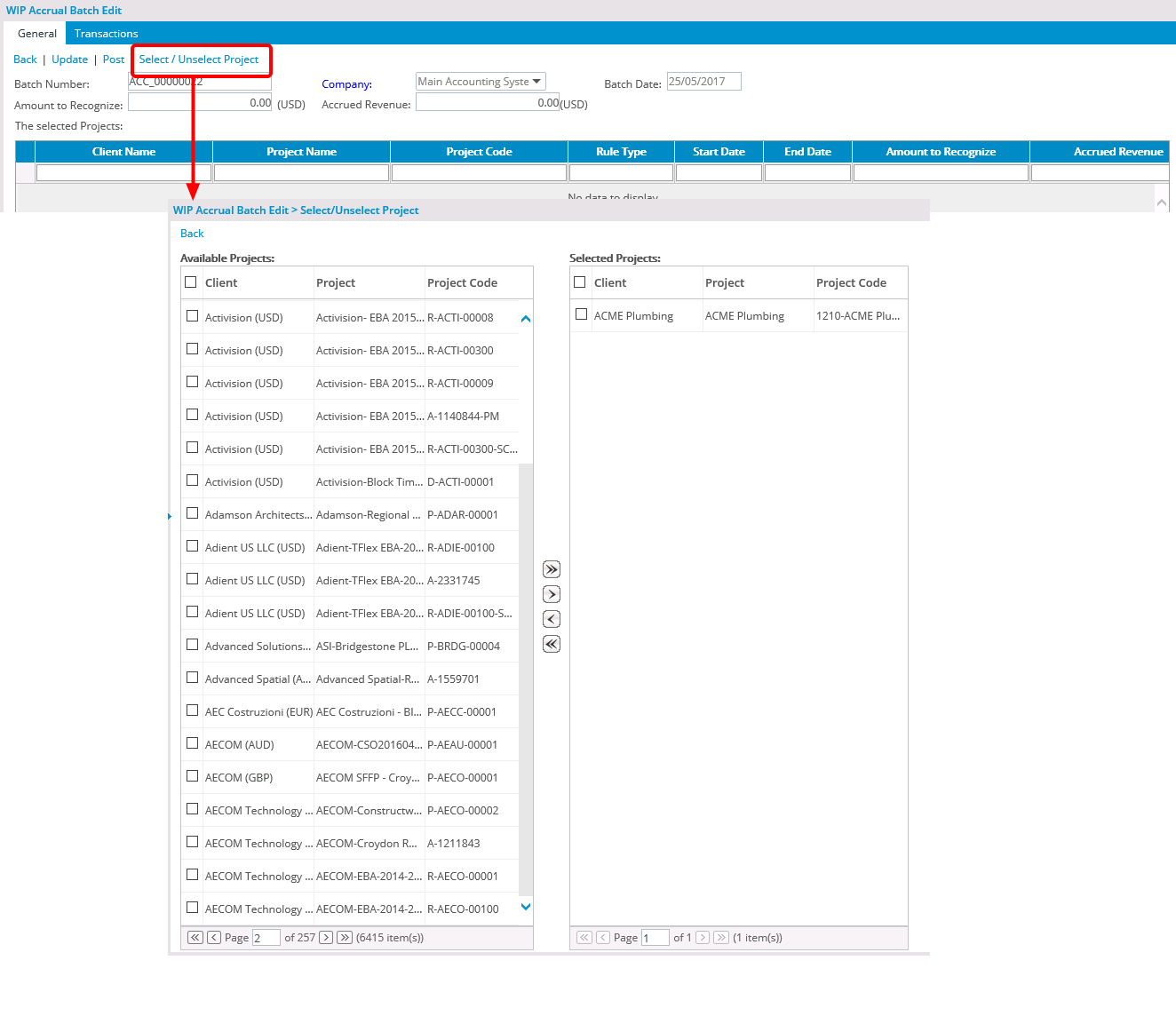 - Click the Select/Unselect Project link to add or remove projects from the WIP accrual batch.